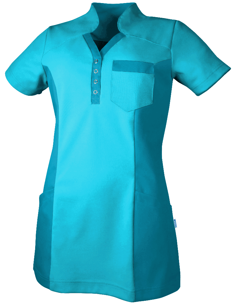 V-hals met tulpkraag en drukknopen; korte mouw; 1 borstzak; 2 zijzakken; zijsplitten; beleg: 65% polyester /35% katoen, 210 g/m²;